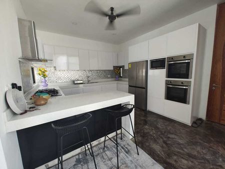 -cocina equipada con meseta de granito, carpinteria completa, parrillacon campana, 2 horno por separado de gas, microondas y refrigerador.